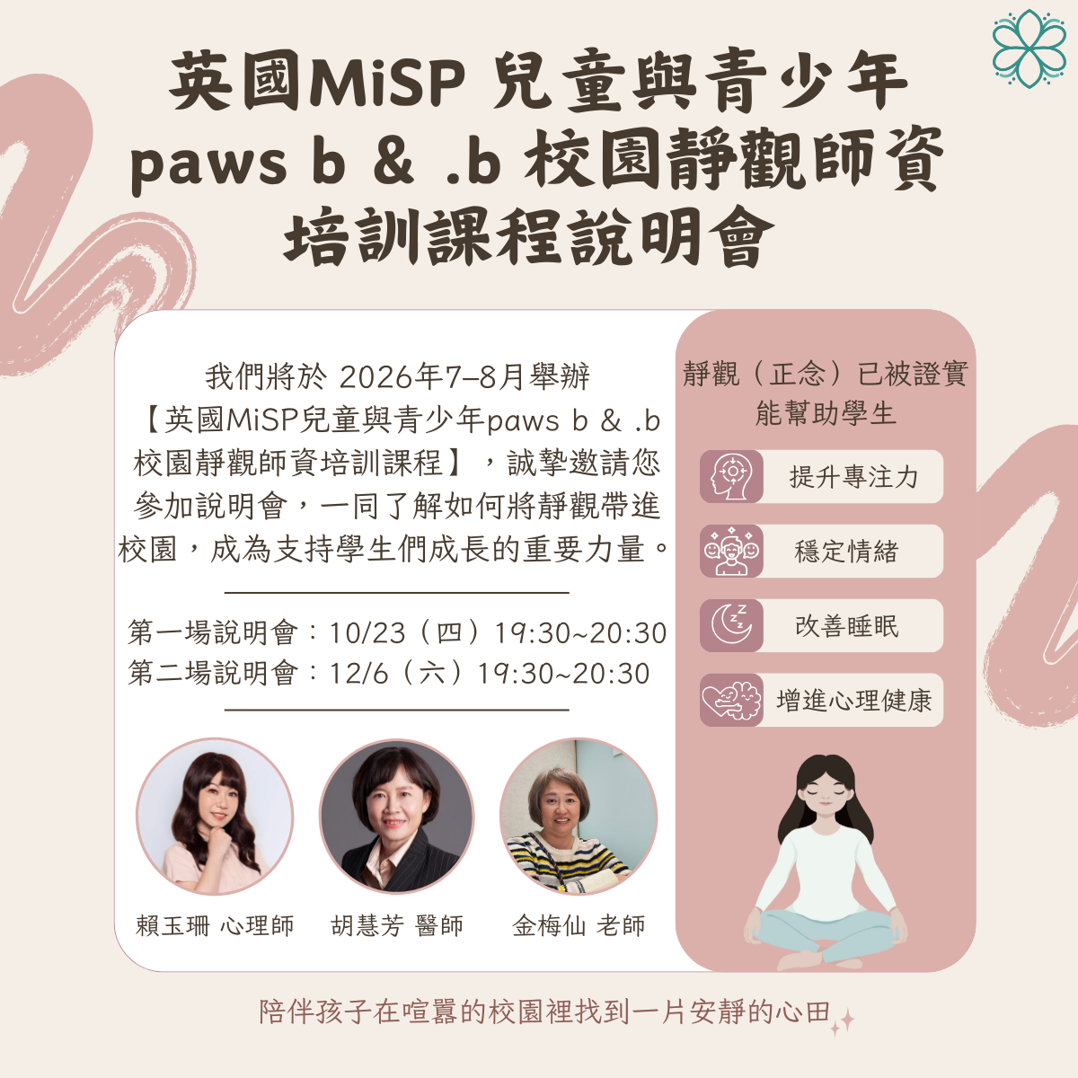 🌱 英國MiSP 兒童與青少年 paws b & .b 校園靜觀師資培訓課程說明會 🌱