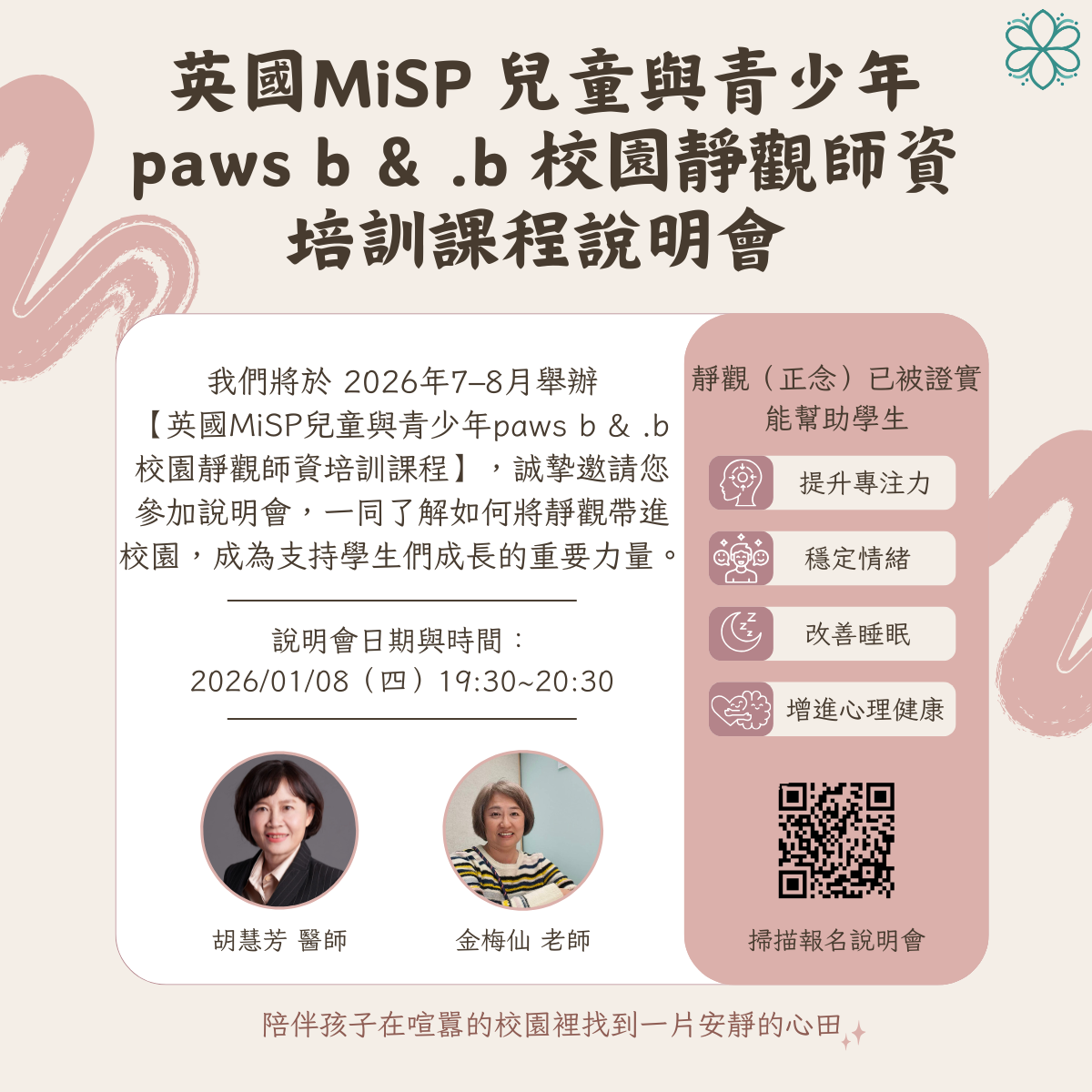 說明會將由胡慧芳醫師與金梅仙老師親自分享,帶你深入了解預計於 2026 年 7–8 月開辦的【英國 MiSP 兒童與青少年校園靜觀師資培訓課程】,包含課程架構及培訓特色等,誠摯歡迎對於學習如何把靜觀帶進教室、社團與校園日常的各位來參加說明會,這場說明會就是給有興趣的你最直接的解答!