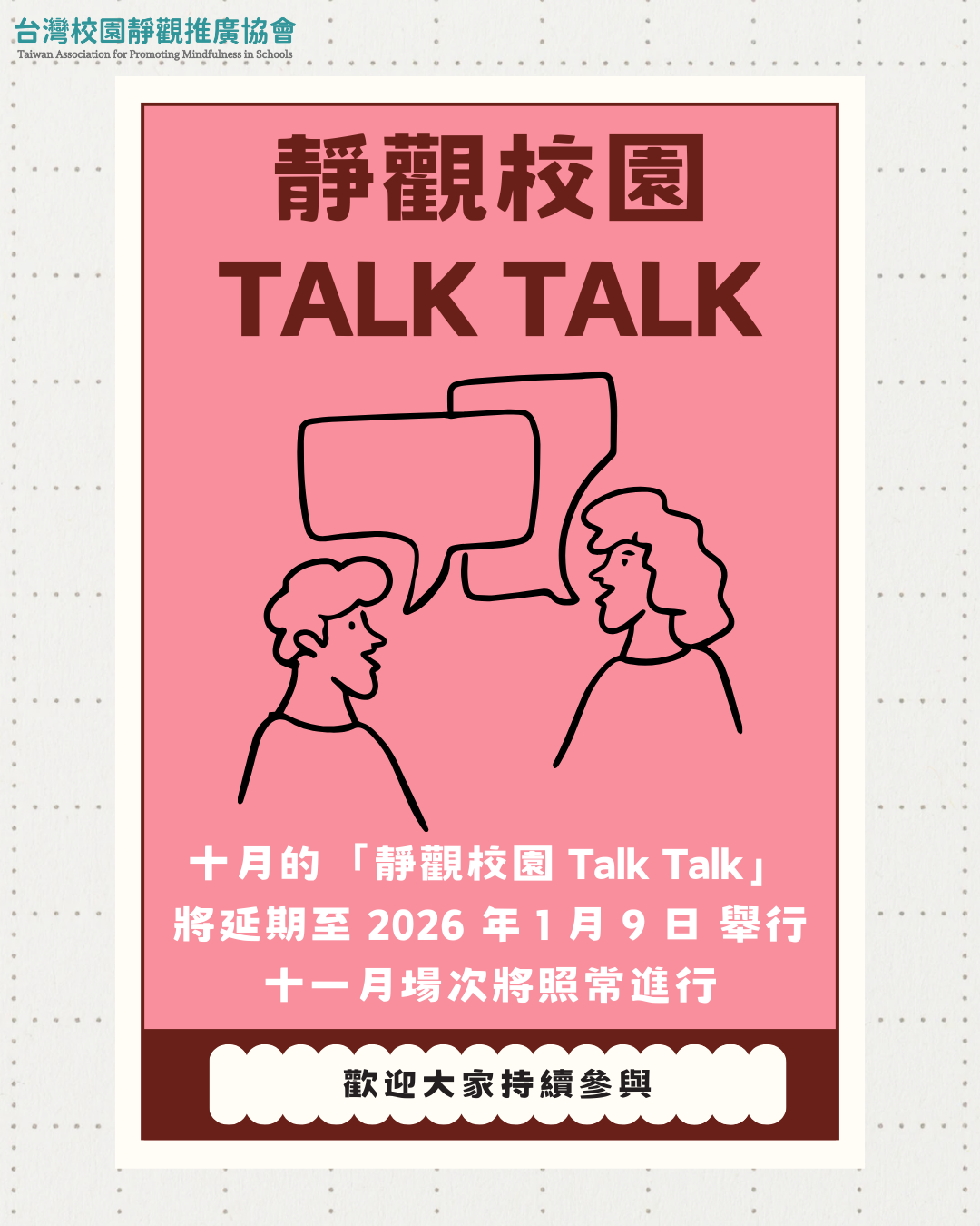 原訂十月的「靜觀校園 Talk Talk」因分享者時間調整,討論後決定延期至 2026/1/9舉辦。